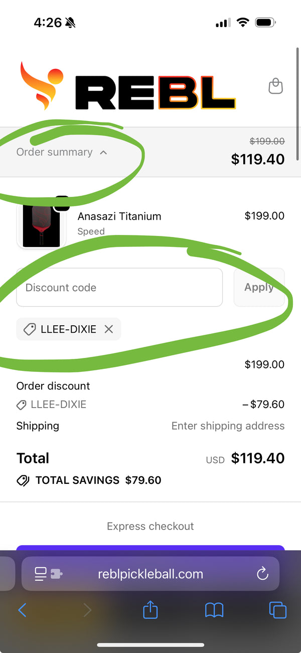 - Your student has a personal code for their 40% discount which needs to be used in order to effectively track their orders. If you or your student don't know where the code is, get with your coach. Each school has set up a google sheet with player info on it and REBL entered each students code (that selected a package)